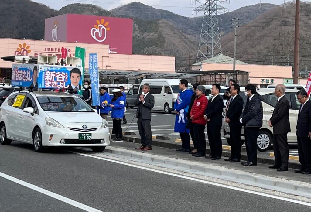 きょう(28日)は母親との面会の前、昼ご飯を食べに出かけたら、スーパーフジの駐車場で広島4区の自民党前職・新谷候補が出陣式を行っていた。