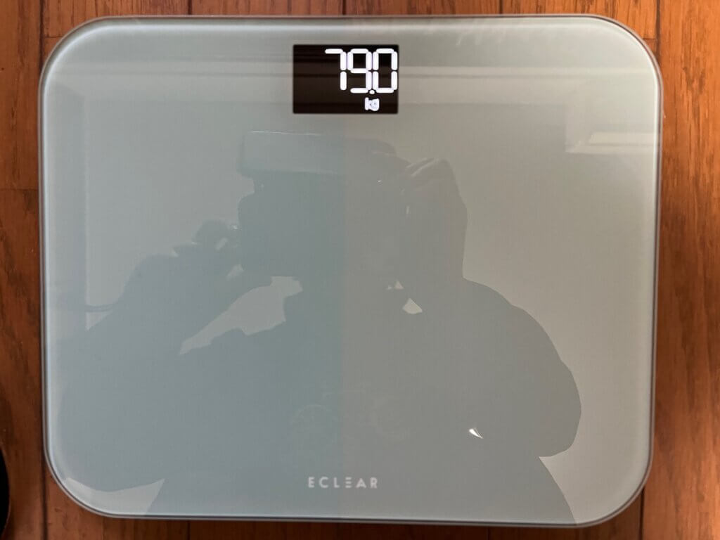 自宅へ持って帰って乗ってみたら、衣服含みで79.0㎏と、確かに去年までのいい状態より3㎏ほど太っている。