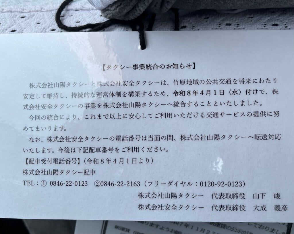 郷里に帰省した際、必ず利用してきた安全タクシーが、4月から吸収合併されることになった。